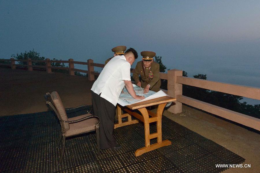 Photo provided by DPRK's official news agency KCNA on June 30, 2014 shows top leader of the Democratic People's Republic of Korea (DPRK) Kim Jong Un overseeing a tactical rocket firing drill of the DPRK military. The DPRK has launched precision guided missiles and fired shells with dispersion effect for striking both individual and group targets of the enemy in the drill, said the KCNA. (Xinhua/KCNA)