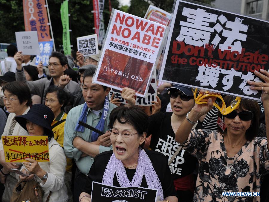 People attend a rally to protest against the attempt to exercise the rights to collective self-defense in front of the Prime Minister's official residence in Tokyo, Japan, June 30, 2014. Thousands of Japanese people gathered here Monday, protesting against Japanese Prime Minister Shinzo Abe's attempt to allow Japan's Self-Defense Forces (SDF) to exercise the rights to collective self-defense. The Japanese government sought to get a green light from the Cabinet on July 1 for a resolution that will allow Japan to exercise collective self-defense rights through reinterpreting the country's pacifist Constitution. (Xinhua/Liu Tian)