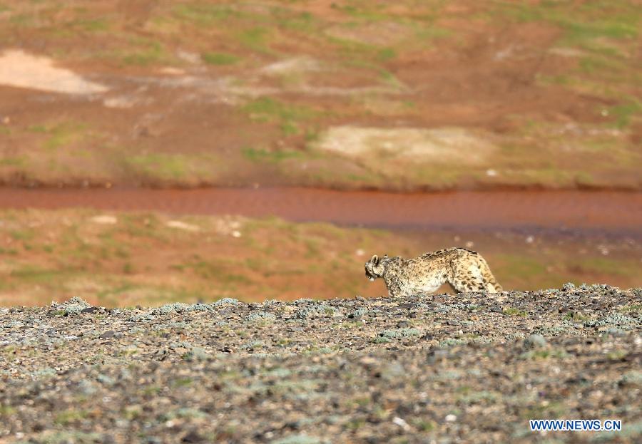 A wild snow leopard looks for food in Chang Tang Nature Reserve, southwest China's Tibet Autonomous Region, June 30, 2014. A wild animal research team organized by local forestry bureau here were lucky to catch a chance to snap shot of a wild snow leopard. (Xinhua/Fan Shihui) |