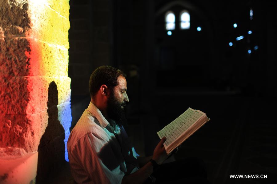 A Palestinian man reads Quran at a Mosque in Gaza City on the third day of the Muslim fasting month of Ramadan, on July 1, 2014. Muslims around the world celebrate Ramadan, the holiest month in the Islamic calendar, in which they abstain from eating, drinking and conducting sexual relations from sunrise to sunset. (Xinhua/Wissam Nassar)