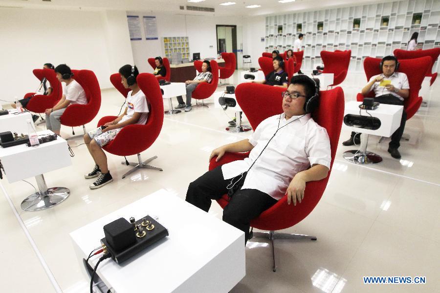 Residents listen to music on rotatable sofa chairs in a music library in Ouhai District of Wenzhou City, east China's Zhejiang Province, July 1, 2014. The music library here, covering more than 200 square meters, collected 592 original music CDs. A total of 15 rotatable sofa chairs are installed in the library for people to enjoy music. (Xinhua/Su Qiaojiang) |