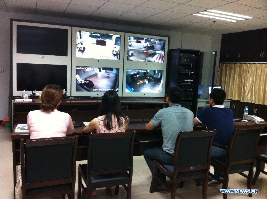 Teachers supervise an exclusive college entrance exam taken by Liu Yanbing and Yi Zhengyong on real-time monitoring screen in Yichun, east China's Jiangxi Province, July 2, 2014. Liu Yanbing and Yi Zhengyong, both from No.3 Middle School in Yichun, were seriously injured during a fight against an assailant who was stabbing passengers on a bus on May 31. They were unable to take the national college entrance exam, on June 7 and 8 as they were still recovering from their injuries. It is the first time Jiangxi's educational authority has organized a separate test for candidates. The two students underwent security checks and went through a metal detector before taking the exam. Digital cameras were installed in the classroom to record the test. More than 10 universities including the prestigious Tsinghua University said earlier that they would like to enroll the students with preferential policies. (Xinhua/Wen Meiliang) |