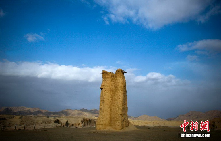 KizilKagha Beacon Tower was built during the Han Dynasty as the alarm tower for the frontier guards. Fire was lighted at night while smoke was set off in daytime. It is the oldest and the best preserved alarm tower on the Middle Route of Ancient Silk Road. (CNS/ Liu Xin)