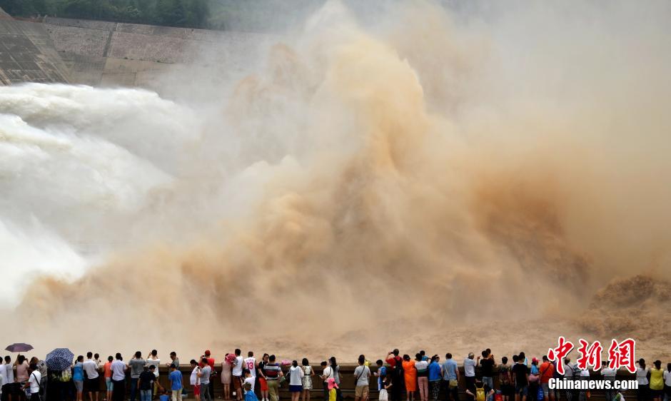 The sediment regulation begins at Xiaolangdi of Yellow River on June 30, 2014. The breathtaking landscape of rolling waves and towering waterfalls attracted visitors across the country. (Photo/CNS)