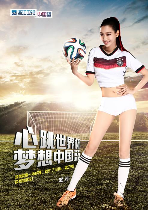 The female reporters from Zhejiang TV dress up in soccer uniforms of the national teams participating in the Brazil FIFA World Cup and pose for photos to celebrate the global soccer tournament. (Photo/CNS)