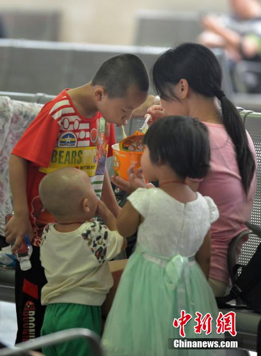 A woman feeds his boy instant noodles at a train station in Fuzhou, capital of southeast China’s Fujian province. (Photo/Chinanews.com)