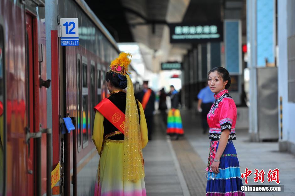 Passengers take train from Kunming to Urumqi at the Kunming Railway Station on July 1, 2014. The new operation diagram was implemented in the national railway across the country on the day. The train from Kunming to Urumqi which covers 4,220 kilometers; it has the longest one-way running time of 66 hours. (Photo/CNS) |