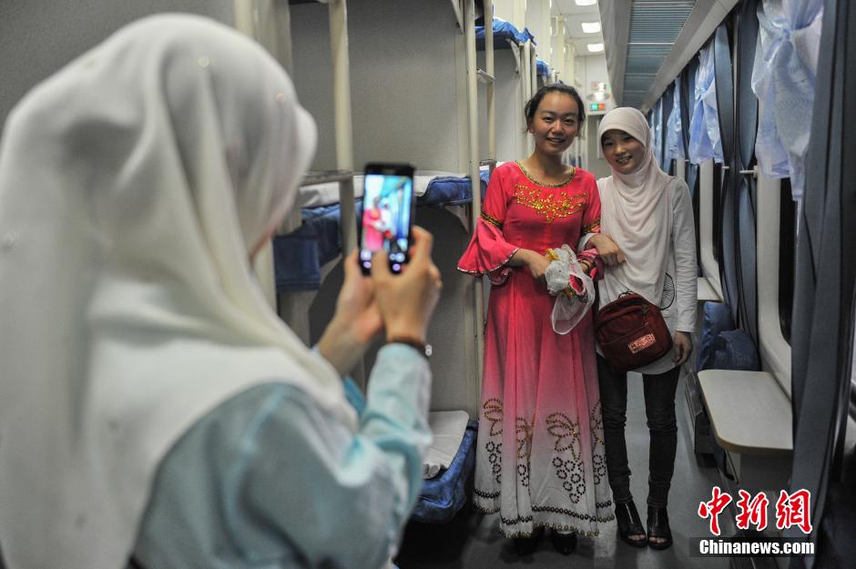 Passengers take train from Kunming to Urumqi at the Kunming Railway Station on July 1, 2014. The new operation diagram was implemented in the national railway across the country on the day. The train from Kunming to Urumqi which covers 4,220 kilometers; it has the longest one-way running time of 66 hours. (Photo/CNS) |