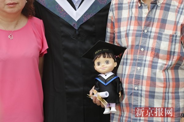 After the ceremony, a student holding a bachelor doll poses for photo with his parents. (Beijing News/Zhou Gangfeng)