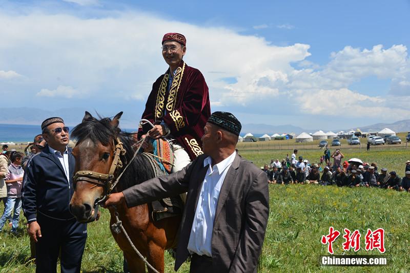 Taiwan woman Li Yongping got married with Harlech, a Kazak herdsman in Xinjiang. They held a wedding along the bank of beautiful Sayram Lake on June 30, 2014. As dowry, the bride’s parents bought 100 sheep for the couple to set up their own livestock-raising business and a flat worth 85,299 U.S. dollars. The groom gave betrothal gifts -- a Akhal-teke horse and two oxen - in return. Every male guest from the bride’s side received a Kazakh hat and a horsewhip, while every female guest got a piece of Kazakh cloth as gift. (CNS/Yu Mingjiang) |