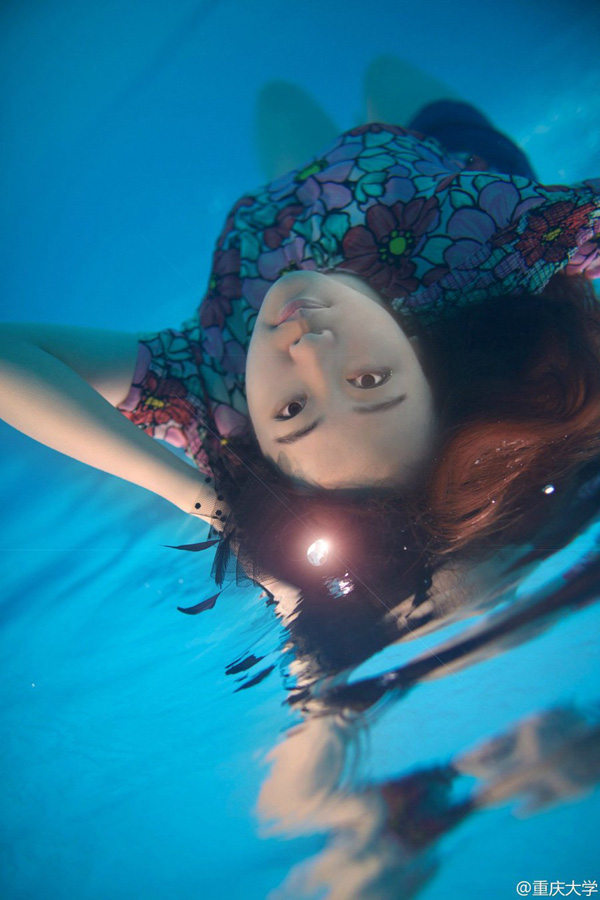 It's graduation season again, students around the country mark their special moments in various ways. Chongqing University's Weibo account posted a group of graduation photos last Tuesday, showing three college girls in bachelor's gowns under water. The photos became a hit on the Internet, being regarded as the most beautiful photos taken by netizens this summer. (Photo/Chongqing University)