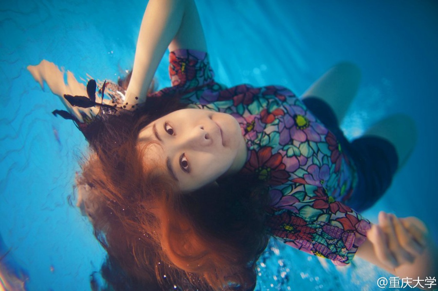 It's graduation season again, students around the country mark their special moments in various ways. Chongqing University's Weibo account posted a group of graduation photos last Tuesday, showing three college girls in bachelor's gowns under water. The photos became a hit on the Internet, being regarded as the most beautiful photos taken by netizens this summer. (Photo/Chongqing University)