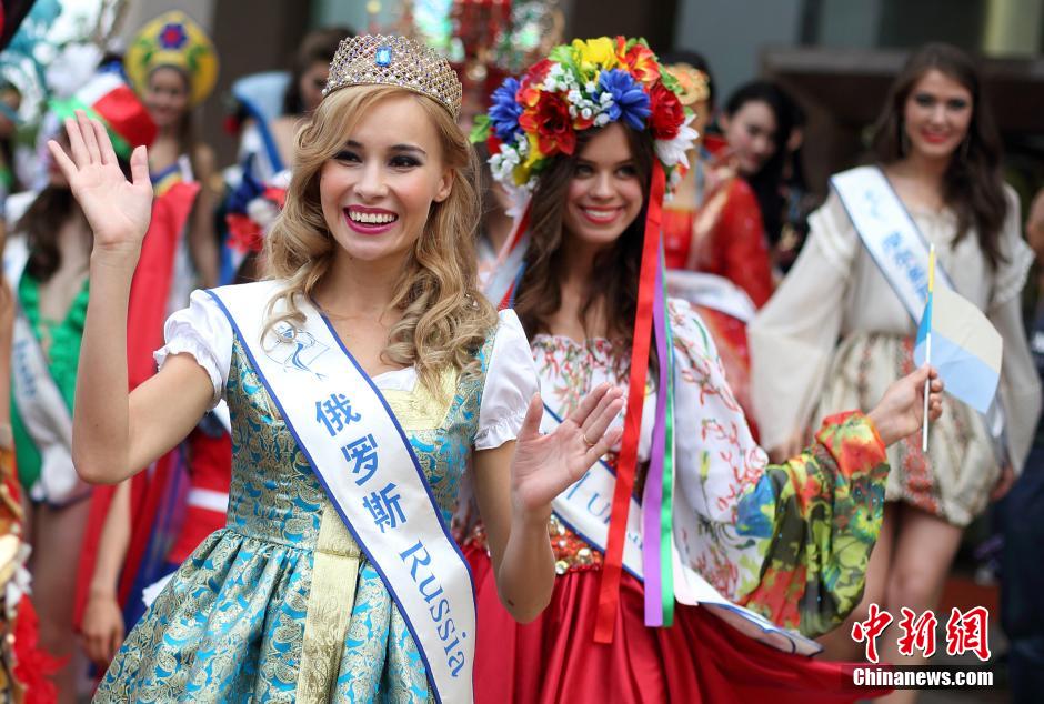 On July 1, 2014, global ambassadors of ecotourism from 42 countries including France, Australia, Panama, and Canada dressed in national costumes gather in Nanjing to raise the curtain of the world tour of culture. They will join promotion events to raise public's green awareness, and show support to the forthcoming 2014 Nanjing Youth Olympic Games during their stay in Nanjing. (Chinanews.com/ Yang Bo)