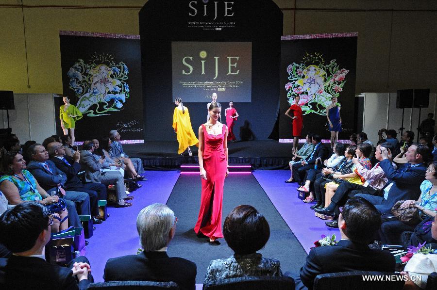 Models present jewelry creations at a fashion show during the Singapore International Jewelry Expo held in Singapore's Marina Bay Sands Expo, on July 3, 2014. The four-day Singapore International Jewelry Expo kicked off here Thursday. (Xinhua/Then Chih Wey) |