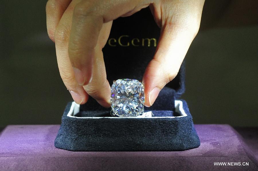 A model presents a gem at a fashion show during the Singapore International Jewelry Expo held in Singapore's Marina Bay Sands Expo, on July 3, 2014. The four-day Singapore International Jewelry Expo kicked off here Thursday. (Xinhua/Then Chih Wey)