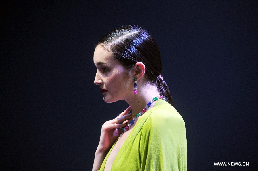 A model presents jewelry creations at a fashion show during the Singapore International Jewelry Expo held in Singapore's Marina Bay Sands Expo, on July 3, 2014. The four-day Singapore International Jewelry Expo kicked off here Thursday. (Xinhua/Then Chih Wey)