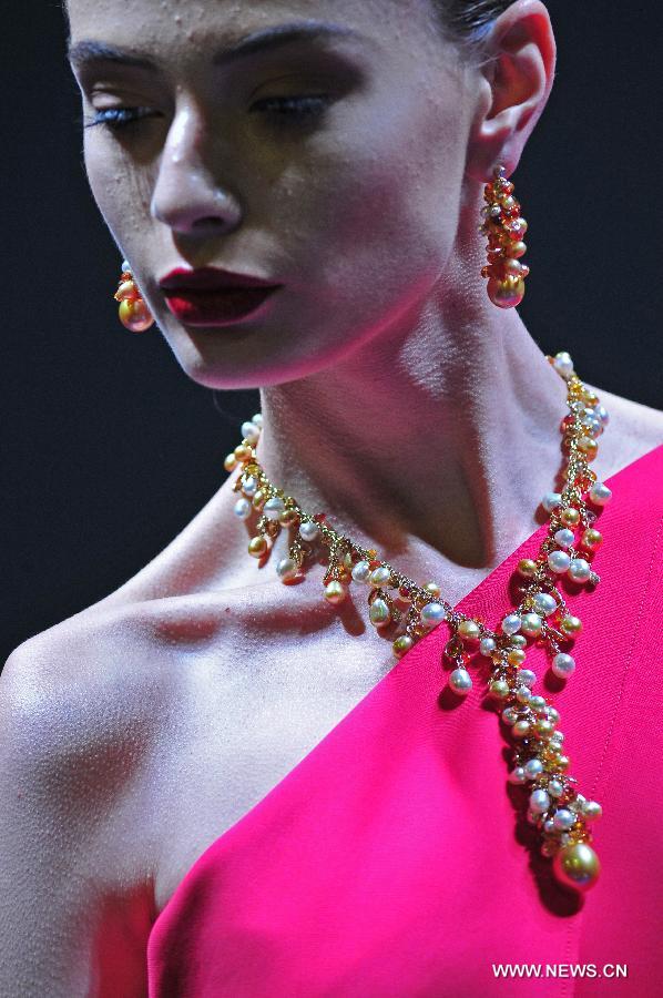 A model presents jewelry creations at a fashion show during the Singapore International Jewelry Expo held in Singapore's Marina Bay Sands Expo, on July 3, 2014. The four-day Singapore International Jewelry Expo kicked off here Thursday. (Xinhua/Then Chih Wey) |