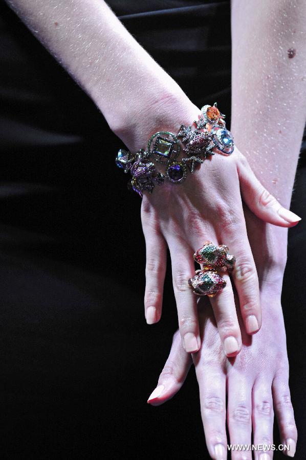 A model presents jewelry creations at a fashion show during the Singapore International Jewelry Expo held in Singapore's Marina Bay Sands Expo, on July 3, 2014. The four-day Singapore International Jewelry Expo kicked off here Thursday. (Xinhua/Then Chih Wey) |