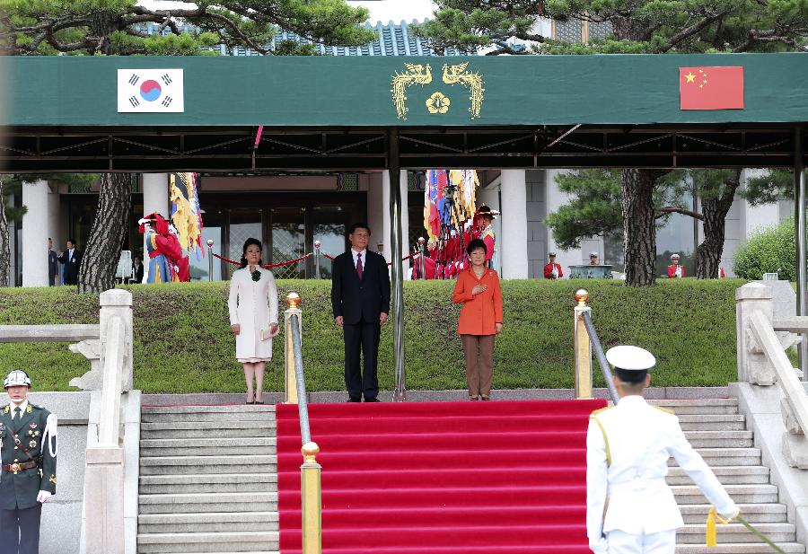South Korean President Park Geun-hye (R) holds a welcome ceremony for Chinese President Xi Jinping (C) at the presidential office Cheong Wa Dae before their talks in Seoul, South Korea, July 3, 2014. (Xinhua/Ding Lin)