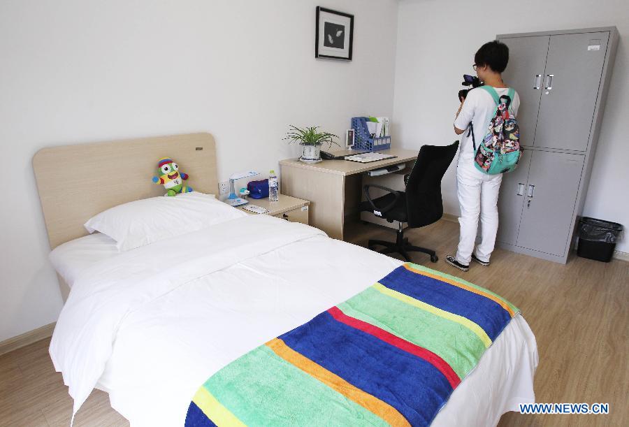 A media worker takes pictures in a dormitory in the Youth Olympic Village in Nanjing, capital of east China's Jiangsu Province, July 4, 2014. The Nanjing 2014 Youth Olympic games will be held from August 16 to 28, attracting 3808 youth athletes from 204 countries and regions. (Xinhua/Gao Jing) |