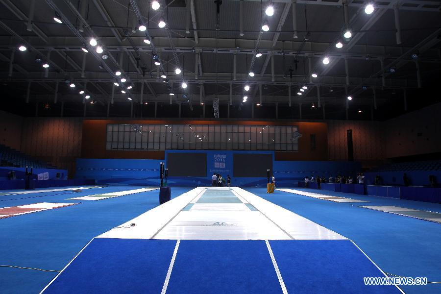 Picture taken on July 4, 2014 shows the interior of the fencing venue for the Nanjing 2014 Youth Olympic games in Nanjing, capital of east China's Jiangsu Province. The Nanjing 2014 Youth Olympic games will be held from August 16 to 28, attracting 3808 youth athletes from 204 countries and regions. (Xinhua/Gao Jing) |
