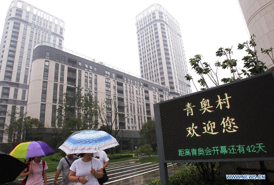 Media workers visit the Youth Olympic Village in Nanjing, capital of east China's Jiangsu Province, July 4, 2014. The Nanjing 2014 Youth Olympic games will be held from August 16 to 28, attracting 3808 youth athletes from 204 countries and regions. (Xinhua/Gao Jing) |