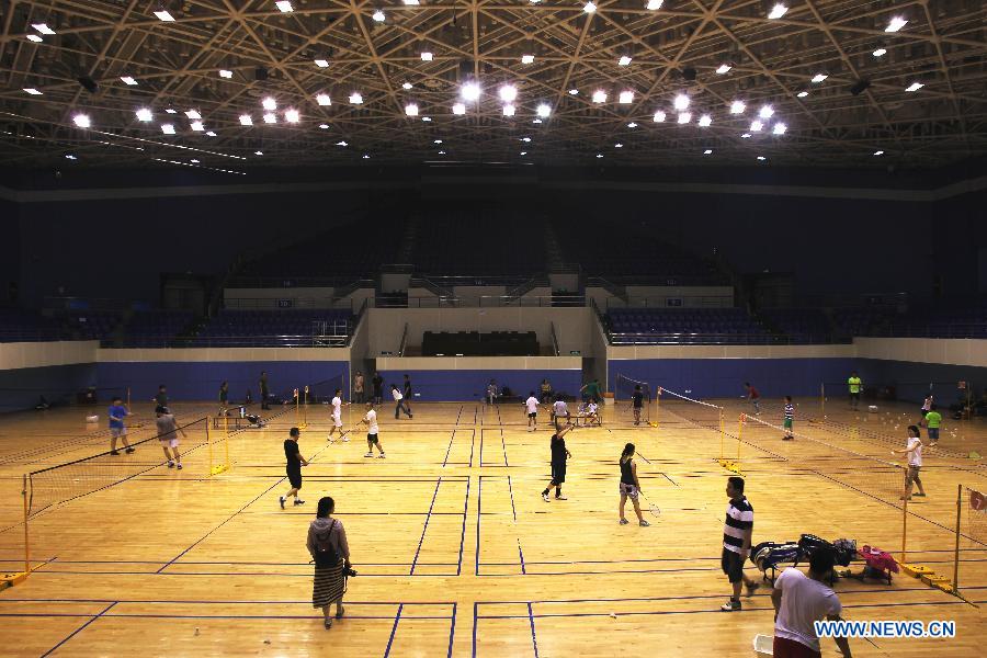 Picture taken on July 4, 2014 shows the interior of the badminton venue for the Nanjing 2014 Youth Olympic games in Nanjing, capital of east China's Jiangsu Province. The Nanjing 2014 Youth Olympic games will be held from August 16 to 28, attracting 3808 youth athletes from 204 countries and regions. (Xinhua/Gao Jing) |