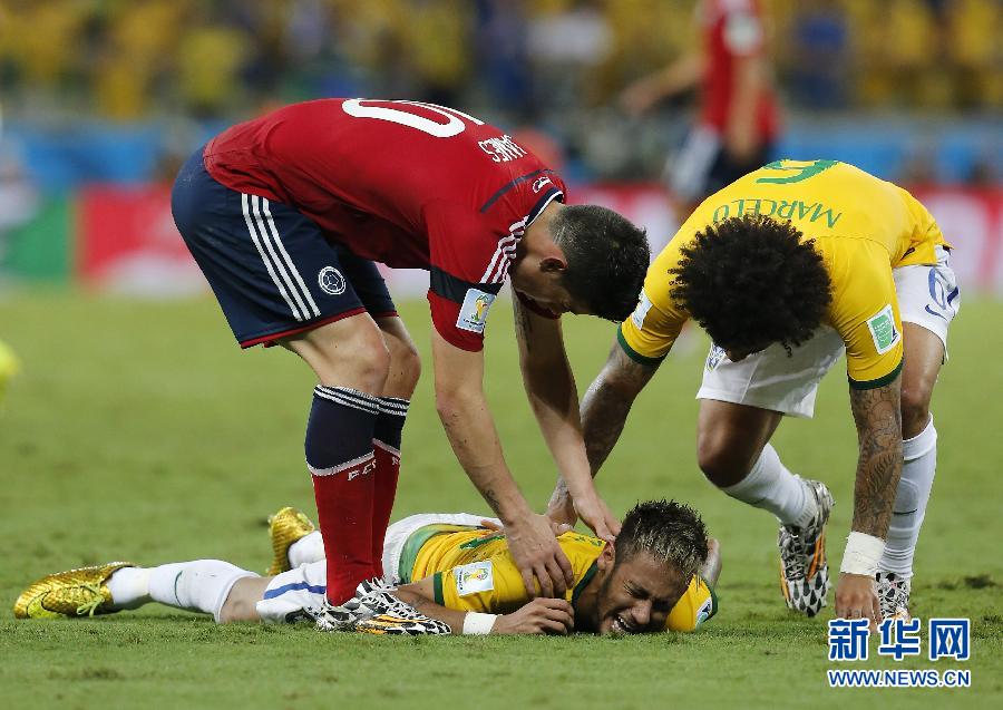 Brazil have suffered a huge setback as team doctor confirmed star man Neymar suffered a broken vertebra and is out of the World Cup after he was stretchered off during the quarterfinal defeat of Colombia. (Photo/Xinhua)