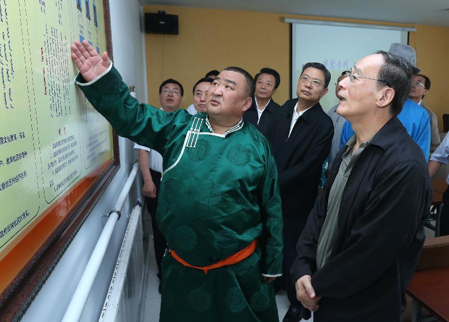Wang Qishan (R), a member of the Standing Committee of the Political Bureau of the Communist Party of China (CPC) Central Committee and secretary of the Central Commission for Discipline Inspection (CCDI) of the CPC, inquires about the grassroots Party building in Xilingol League, north China's Inner Mongolia Autonomous Region, July 3, 2014. Wang made an inspection tour in Xilingol League from July 3 to 4. (Xinhua/Pang Xinglei) |