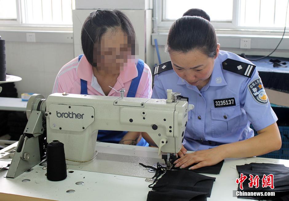 Tang guides a recovering addict to learn the sewing skills at 9:26 a.m. in the female compulsory rehabilitation center in east China's Jiangsu province. (Chinanews.com/Su Shifa)