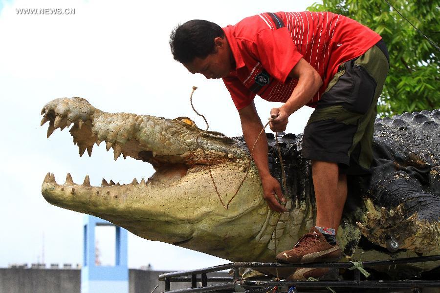 A worker unloads "Longlong", a 21-foot robot crocodile from a truck at the Crocodile Park in Pasay City, the Philippines, July 5, 2014. The robot crocodile, costing around 80,000 pesos, or 1,818 U.S. dollars, is inspired by a giant saltwater crocodile, the longest crocodile on the earth, which died while in captivity in southern Philippines in 2013. (Xinhua/Rouelle Umali) |