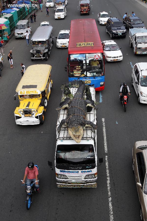 "Longlong", a 21-foot robot crocodile, is on the way to the Crocodile Park in Pasay City, the Philippines, July 5, 2014. The robot crocodile, costing around 80,000 pesos, or 1,818 U.S. dollars, is inspired by a giant saltwater crocodile, the longest crocodile on the earth, which died while in captivity in southern Philippines in 2013. (Xinhua/Rouelle Umali) |