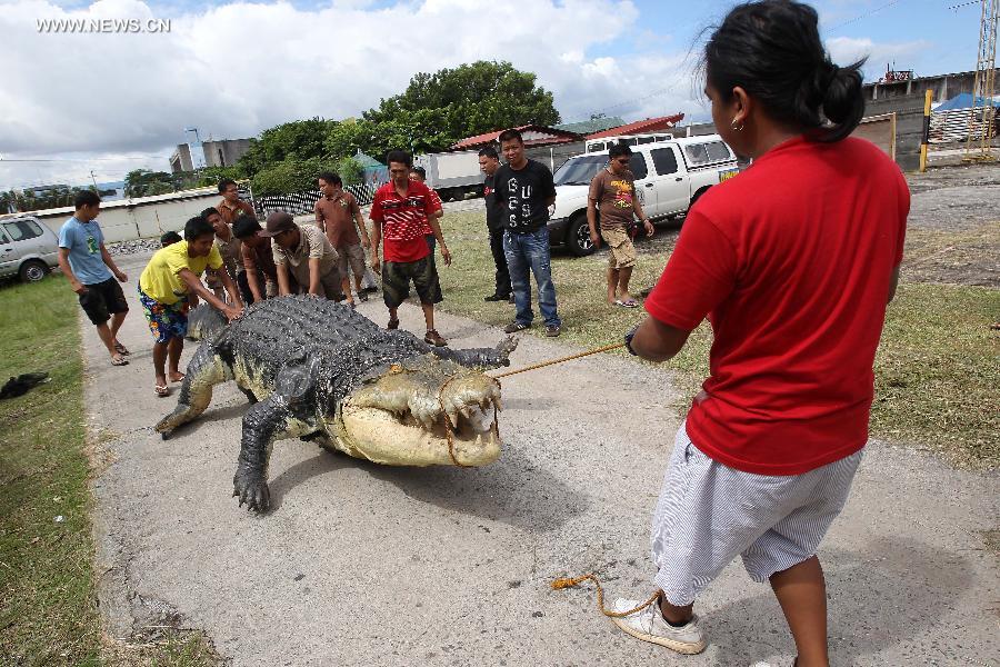 Workers pull "Longlong", a 21-foot robot crocodile from a truck at the Crocodile Park in Pasay City, the Philippines, July 5, 2014. The robot crocodile, costing around 80,000 pesos, or 1,818 U.S. dollars, is inspired by a giant saltwater crocodile, the longest crocodile on the earth, which died while in captivity in southern Philippines in 2013. (Xinhua/Rouelle Umali) |