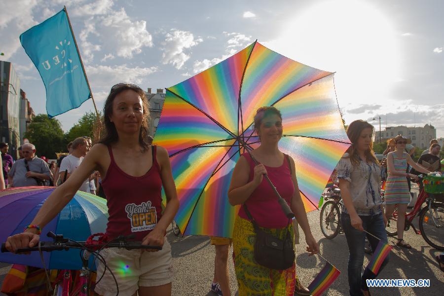 Participants of the Gay Pride Parade march across the city in Budapest, Hungary, July 5, 2014. The theme of the parade was "Budapest Pride: 365", meaning that participants were striving for acceptance through the year, not just on this day. Various groups claiming to represent "family values" held counter-demonstrations along the parade route. Police arrested two demonstrators.(Xinhua/Attila Volgyi)