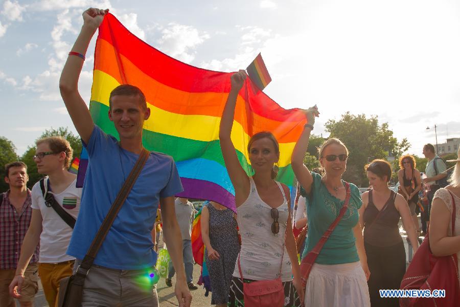 Participants of the Gay Pride Parade march across the city in Budapest, Hungary, July 5, 2014. The theme of the parade was "Budapest Pride: 365", meaning that participants were striving for acceptance through the year, not just on this day. Various groups claiming to represent "family values" held counter-demonstrations along the parade route. Police arrested two demonstrators.(Xinhua/Attila Volgyi) |