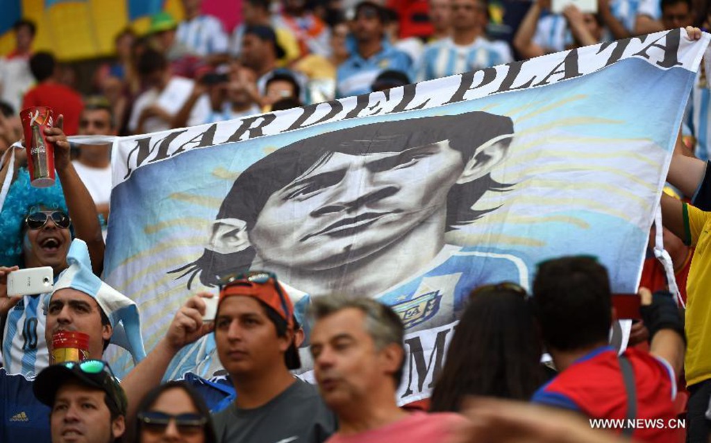 Argentina's fans celebrate the victory after a quarter-finals match between Argentina and Belgium of 2014 FIFA World Cup at the Estadio Nacional Stadium in Brasilia, Brazil, on July 5, 2014. Argentina won 1-0 over Belgium and qualified for the semi-finals. (Xinhua/Liu Dawei) |