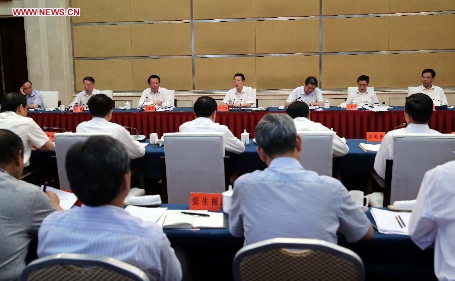 Chinese Vice Premier Zhang Gaoli (rear C), also a member of the Standing Committee of the Political Bureau of the Communist Party of China Central Committee, presides over a meeting with officials from provinces and autonomous regions including Shaanxi, Gansu, Qinghai, Ningxia and Xinjiang, in Lanzhou, capital of northwest China's Gansu Province, July 4, 2014. Zhang Gaoli made an inspection tour to Ningxia Hui Autonomous Region and Gansu Province from July 2 to 5. (Xinhua/Liu Weibing) |