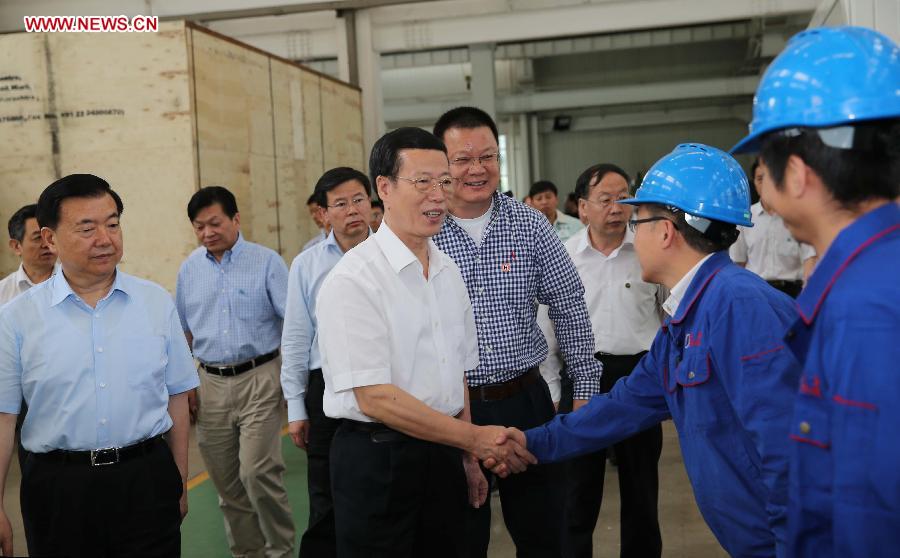 Chinese Vice Premier Zhang Gaoli (C), also a member of the Standing Committee of the Political Bureau of the Communist Party of China Central Committee, visits Lanzhou Haimo Technologies Co. Ltd. in Lanzhou, capital of northwest China's Gansu Province, July 3, 2014. Zhang Gaoli made an inspection tour to Ningxia Hui Autonomous Region and Gansu Province from July 2 to 5. (Xinhua/Liu Weibing) |