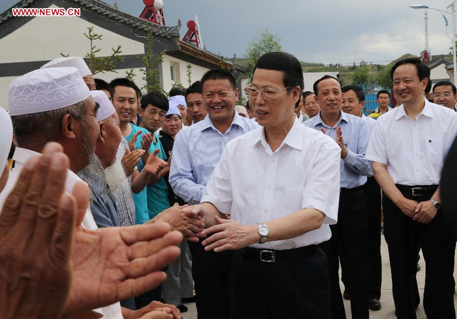 Chinese Vice Premier Zhang Gaoli (front R), also a member of the Standing Committee of the Political Bureau of the Communist Party of China Central Committee, visits a migrated village in Guyuan, Ningxia Hui Autonomous Region, July 2, 2014. Zhang Gaoli made an inspection tour to Ningxia Hui Autonomous Region and Gansu Province from July 2 to 5. (Xinhua/Liu Weibing) |