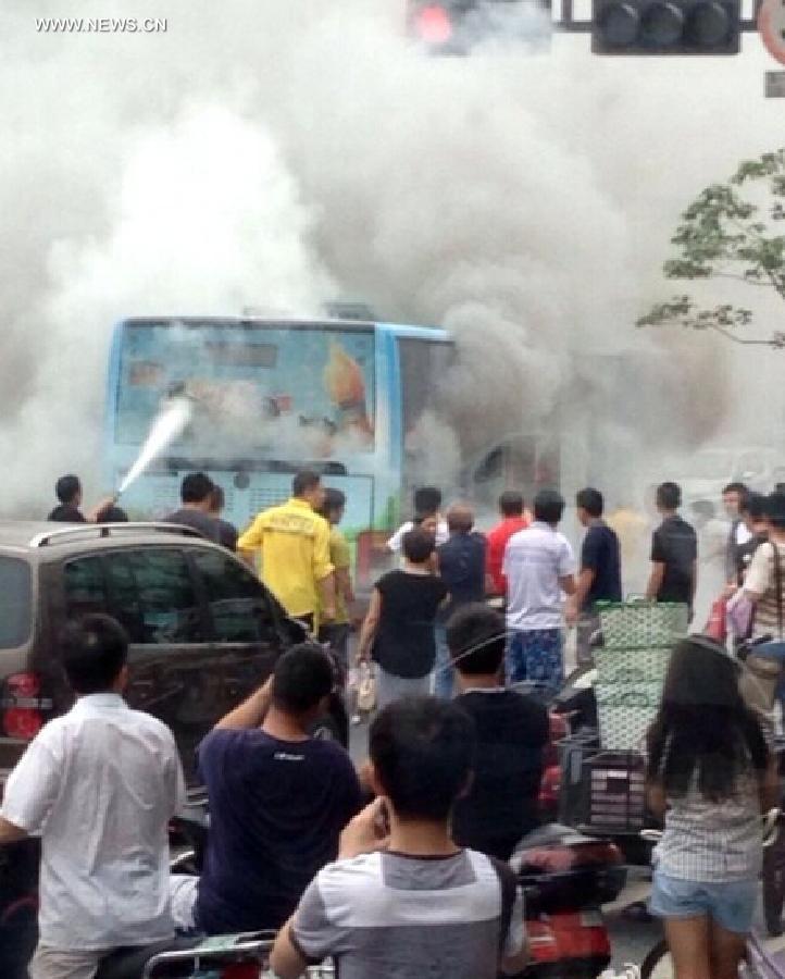 Photo taken by a mobile phone shows smokes rising from a burning bus in Hangzhou, capital of east China's Zhejiang Province, July 5, 2014. Witnesses say some people aboard were injured and sent to hospital. Local police is investigating on the spot and the reason of the fire is still unknown. There was no death report yet. (Xinhua)