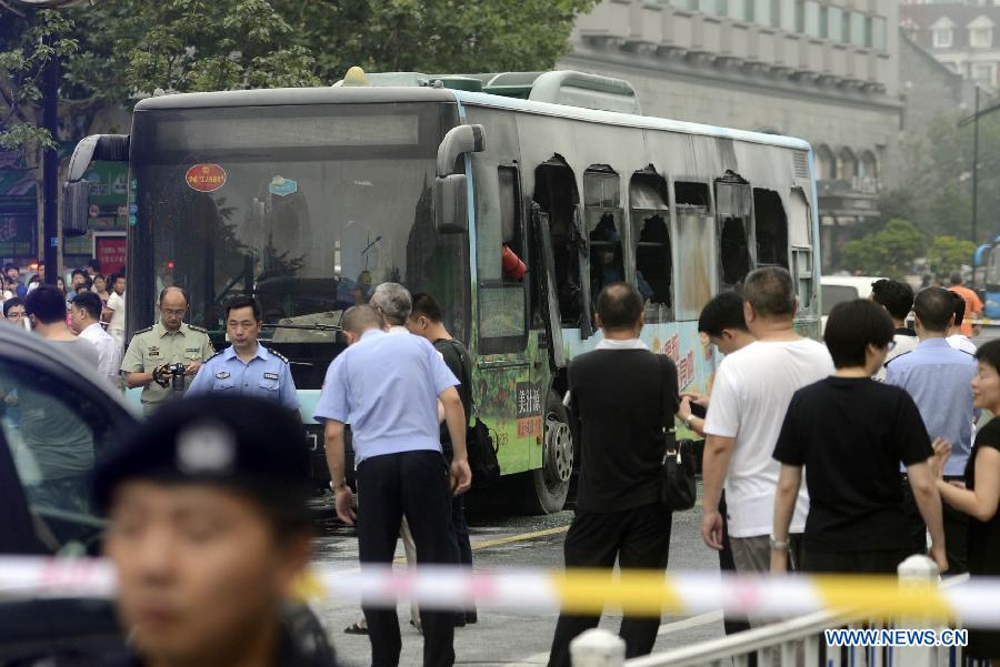 The fire broke out at around 5 p.m. Saturday when the bus was on the Qingchun Road in the downtown of Hangzhou.