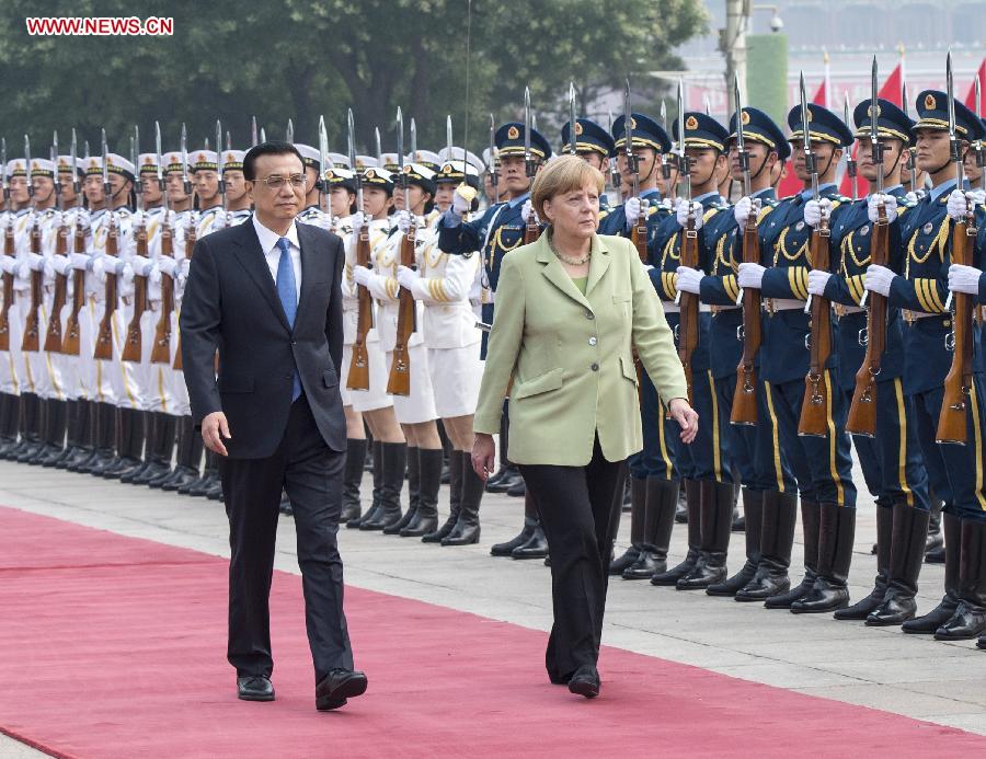 Chinese Premier Li Keqiang (L) holds a welcoming ceremony for German Chancellor Angela Merkel in Beijing, capital of China, July 7, 2014. (Xinhua/Wang Ye)