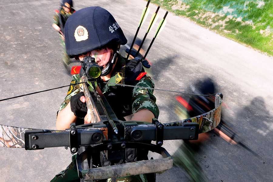 Since summer, the women special assault team of the Frontier Corps of Armed Police in Xinjiang has been conducting high-intensity training. Every day, they finish basic physic training including 5 km cross-country running carrying a load of 20 kilograms, pulling tires and carrying logs. They also conduct exercise such as climbing and shooting. (Xinhua Photo)