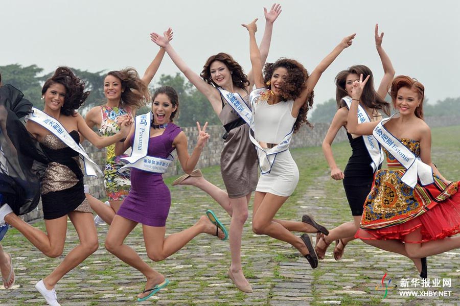 On July 4, 2014, global ambassadors of ecotourism from 42 countries including France, Australia, Panama, and Canada take off high-heeled shoes and ascend the Nanjing City Wall. They held the billboards to enhance the public awareness of environmental protection. (XHBY.NET/ Wan Chengpeng)