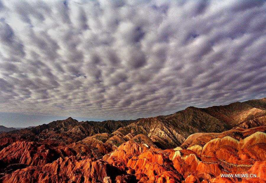 Photo taken on July 7, 2014 shows the scenery at Zhangye Danxia Landform Geological Park in Zhangye City, northwest China's Gansu Province. Danxia, which means "rosy cloud", is a special landform formed from reddish sandstone that has been eroded over time into a series of mountains surrounded by curvaceous cliffs and many unusual rock formations. (Xinhua/Wang Song)