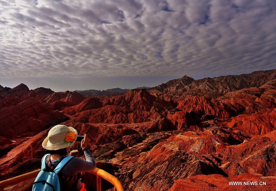 A visitor takes photos at Zhangye Danxia Landform Geological Park in Zhangye City, northwest China's Gansu Province, July 7, 2014. Danxia, which means "rosy cloud", is a special landform formed from reddish sandstone that has been eroded over time into a series of mountains surrounded by curvaceous cliffs and many unusual rock formations. (Xinhua/Wang Song) |
