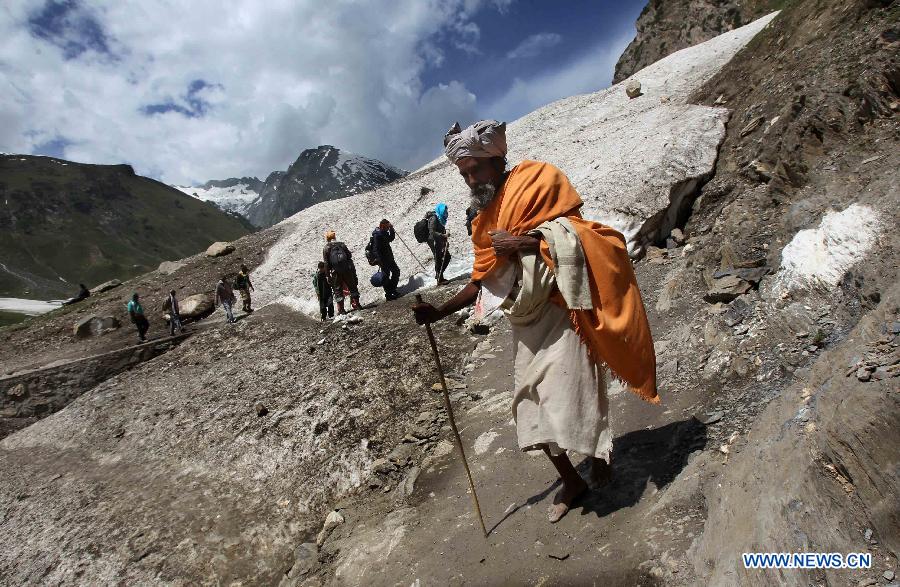 Hindu pilgrims are on their way to holy Amarnath cave near Sheshnag, south of Srinagar, Indian-controlled Kashmir, June 7, 2014. Tens of thousands Hindu pilgrims annually go to Amarnath cave which lies 3,888 meters above sea level in Indian-controlled Kashmir amid tight security. (Xinhua/Javed Dar)