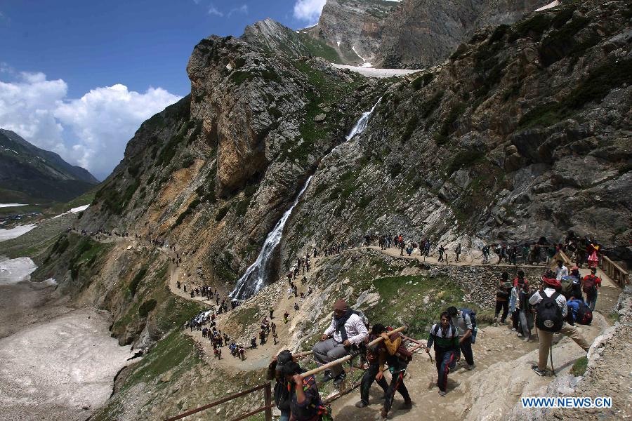 Hindu pilgrims are on their way to holy Amarnath cave near Sheshnag, south of Srinagar, Indian-controlled Kashmir, June 7, 2014. Tens of thousands Hindu pilgrims annually go to Amarnath cave which lies 3,888 meters above sea level in Indian-controlled Kashmir amid tight security. (Xinhua/Javed Dar)