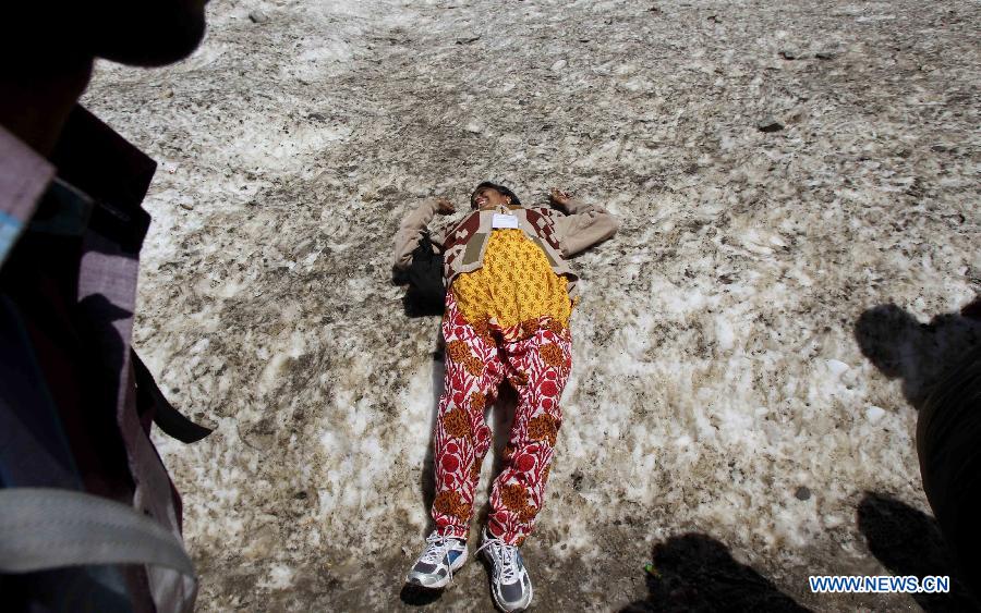 A Hindu pilgrim takes a rest on snow on their way to holy Amarnath cave near Sheshnag, south of Srinagar, Indian-controlled Kashmir, June 7, 2014. Tens of thousands Hindu pilgrims annually go to Amarnath cave which lies 3,888 meters above sea level in Indian-controlled Kashmir amid tight security. (Xinhua/Javed Dar) |