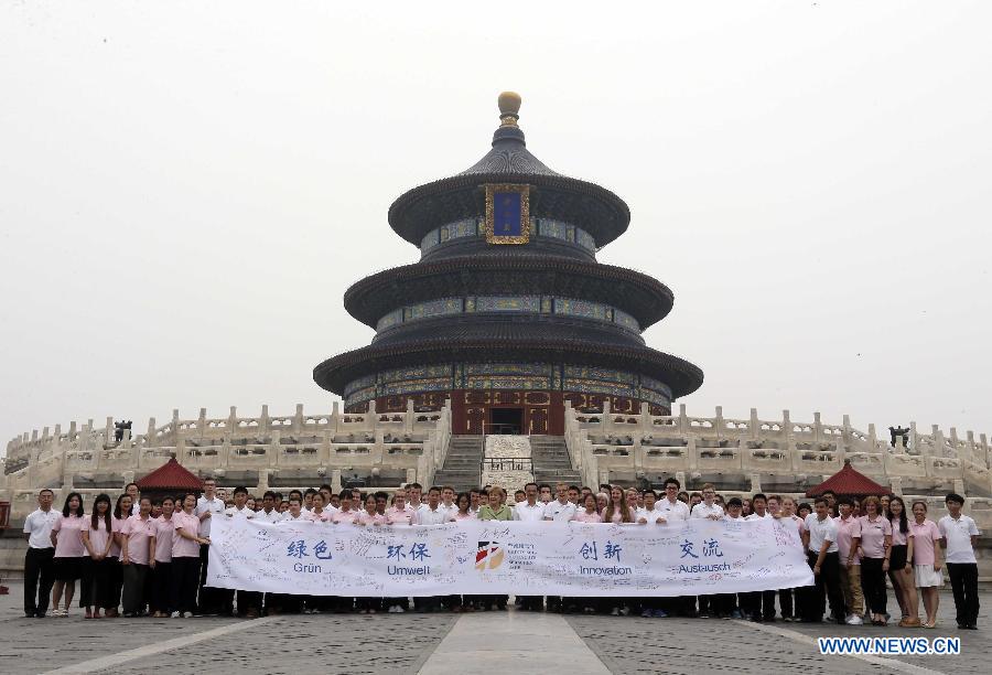 Chinese Premier Li Keqiang and German Chancellor Angela Merkel pose for a group picture with youngsters attending the closing ceremony of "the Year of Languages" program between China and Germany, an initiative meant to encourage the two peoples to study each other's language, at the Temple of Heaven, a famous scenic spot in Beijing, capital of China, July 7, 2014. (Xinhua/Ding Lin) |